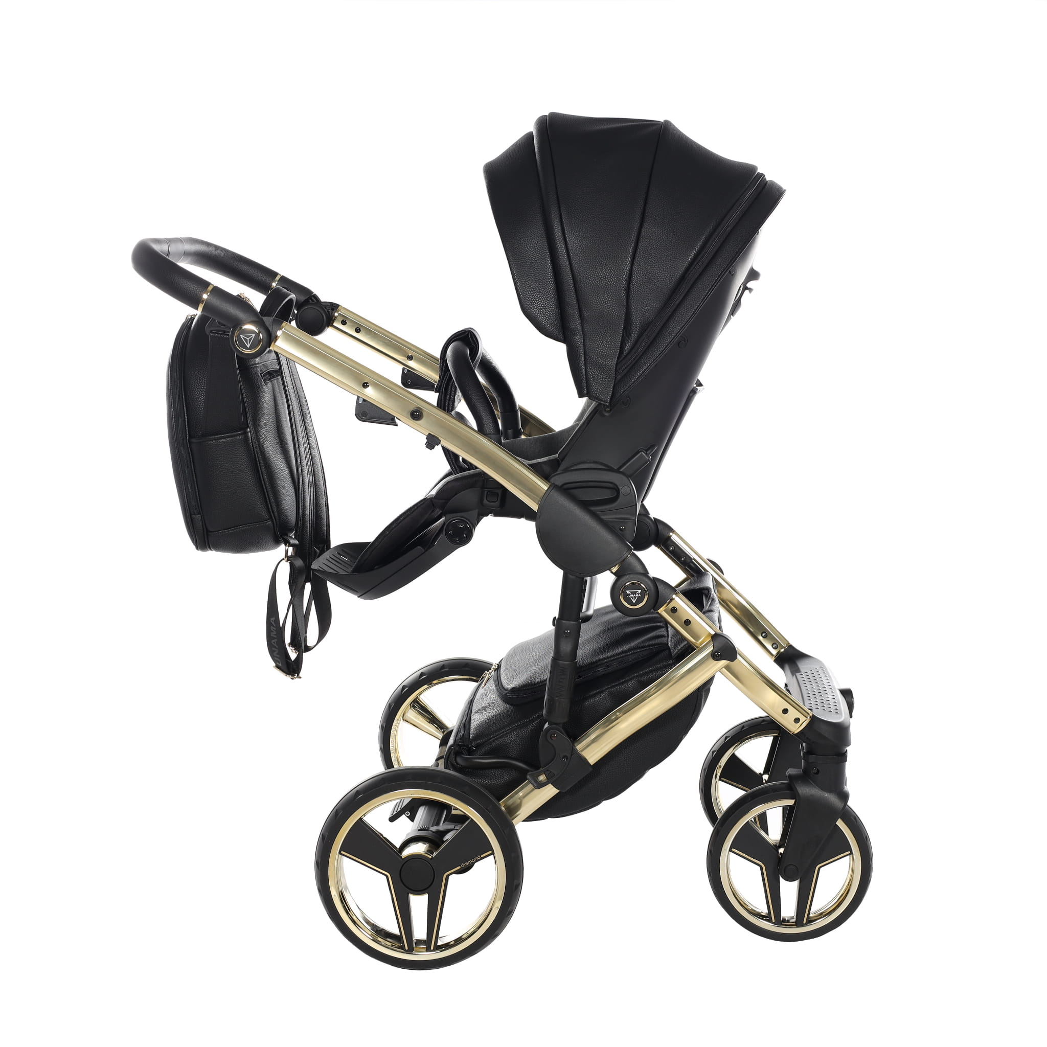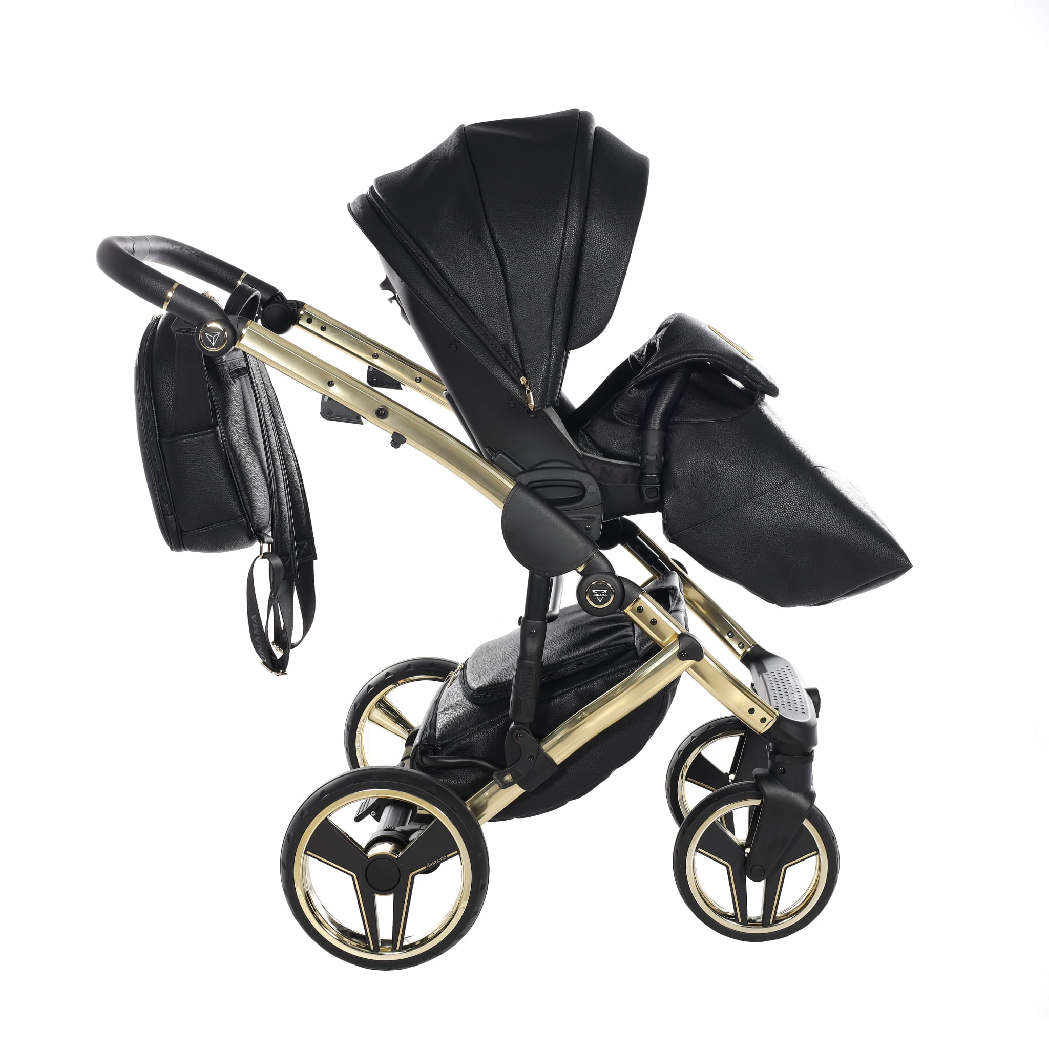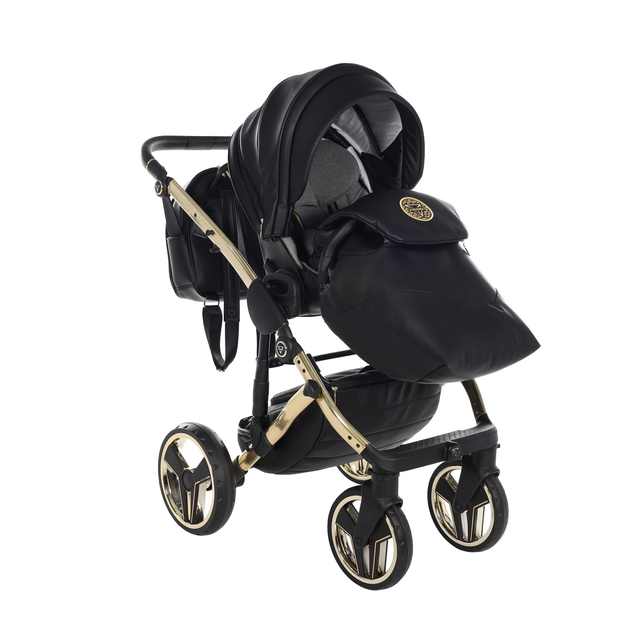 Junama Hand Craft wózek dziecięcy z czarnej ekoskóry luksusowy wygląd dodaje złota gondola. Wózek dziecięcy w zestawie z gondolą oraz spacerówką wykonaną z ekoskóry.