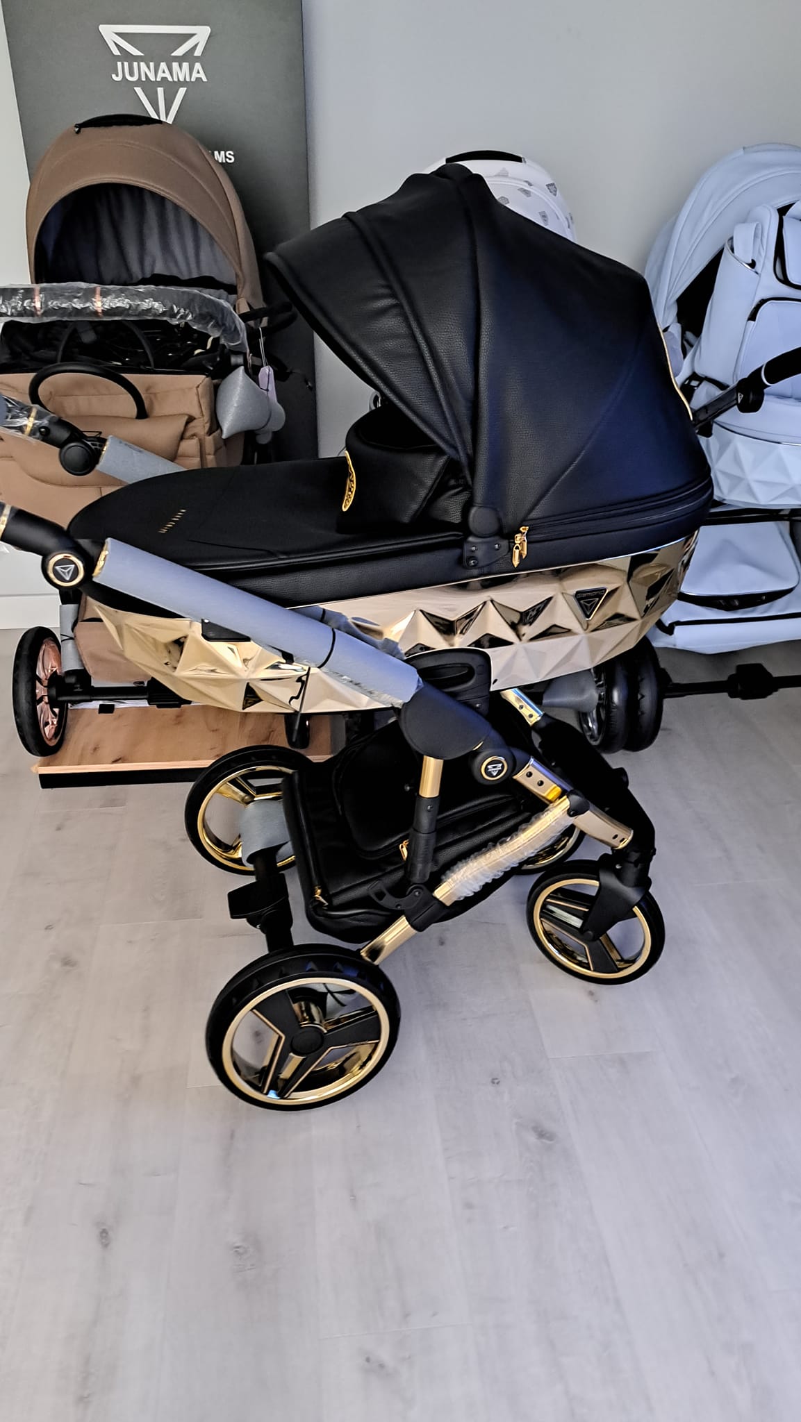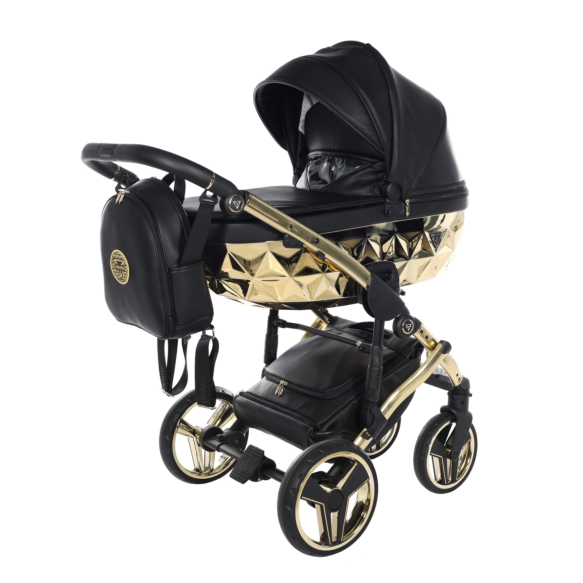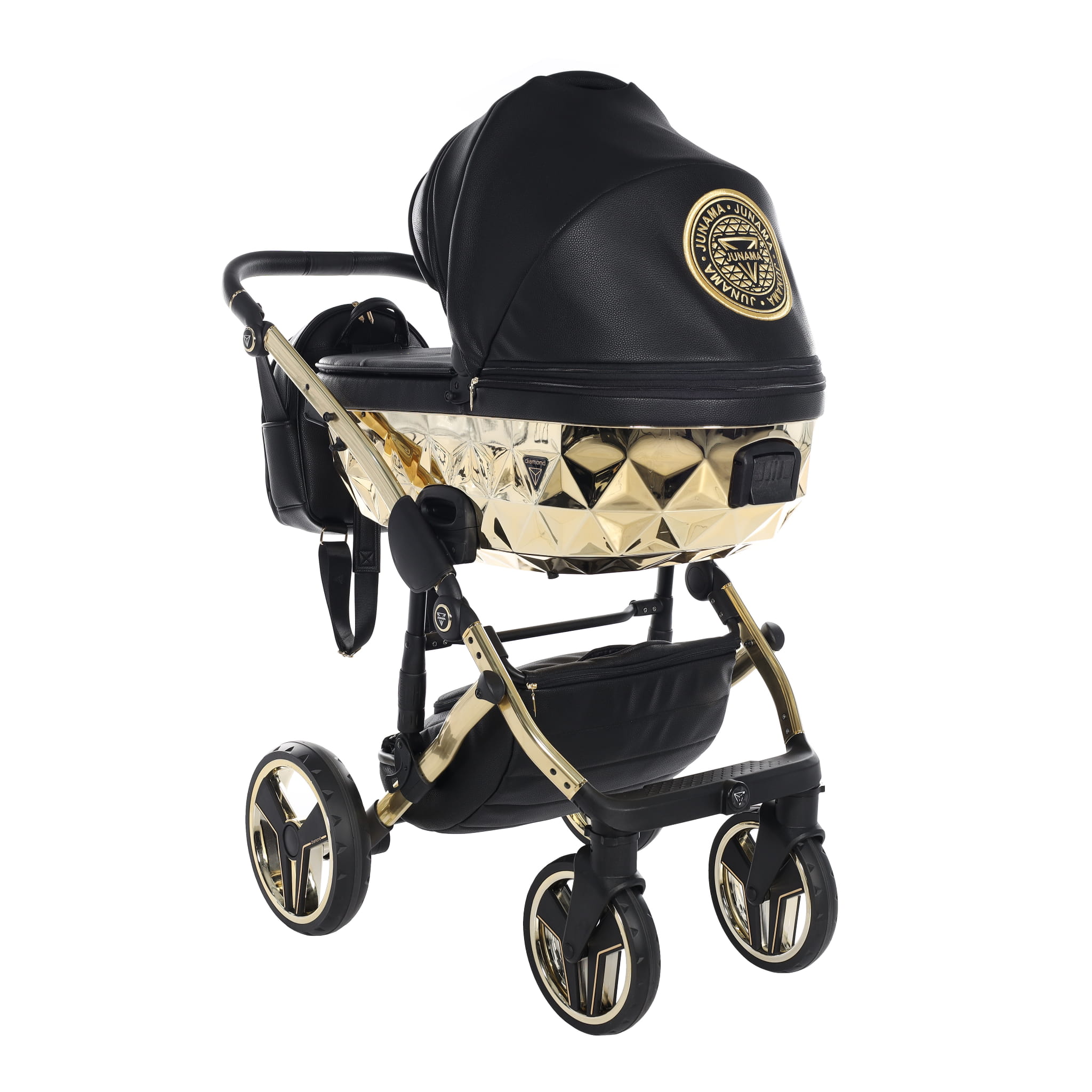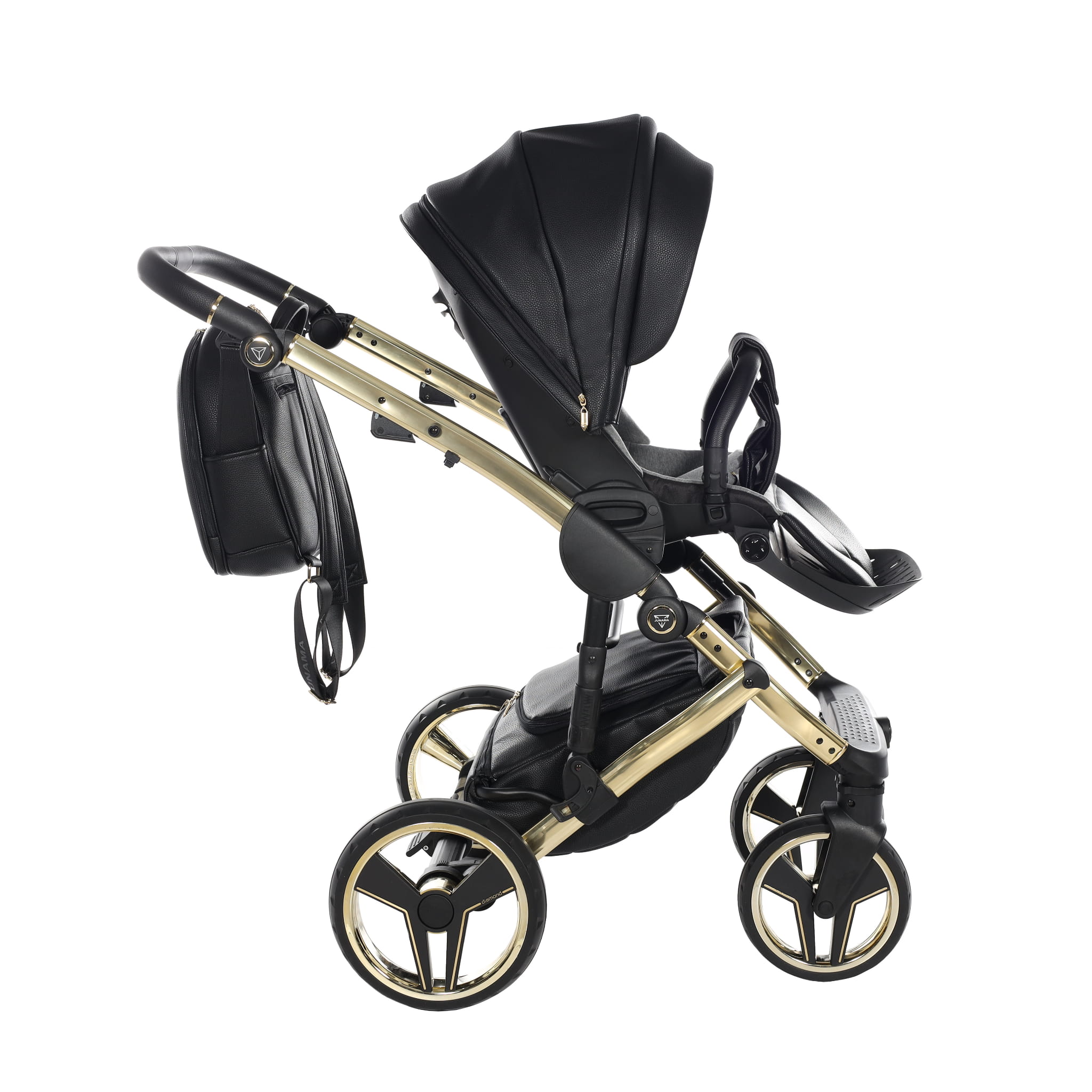 Junama Hand Craft wózek dziecięcy z czarnej ekoskóry luksusowy wygląd dodaje złota gondola. Wózek dziecięcy w zestawie z gondolą oraz spacerówką wykonaną z ekoskóry.