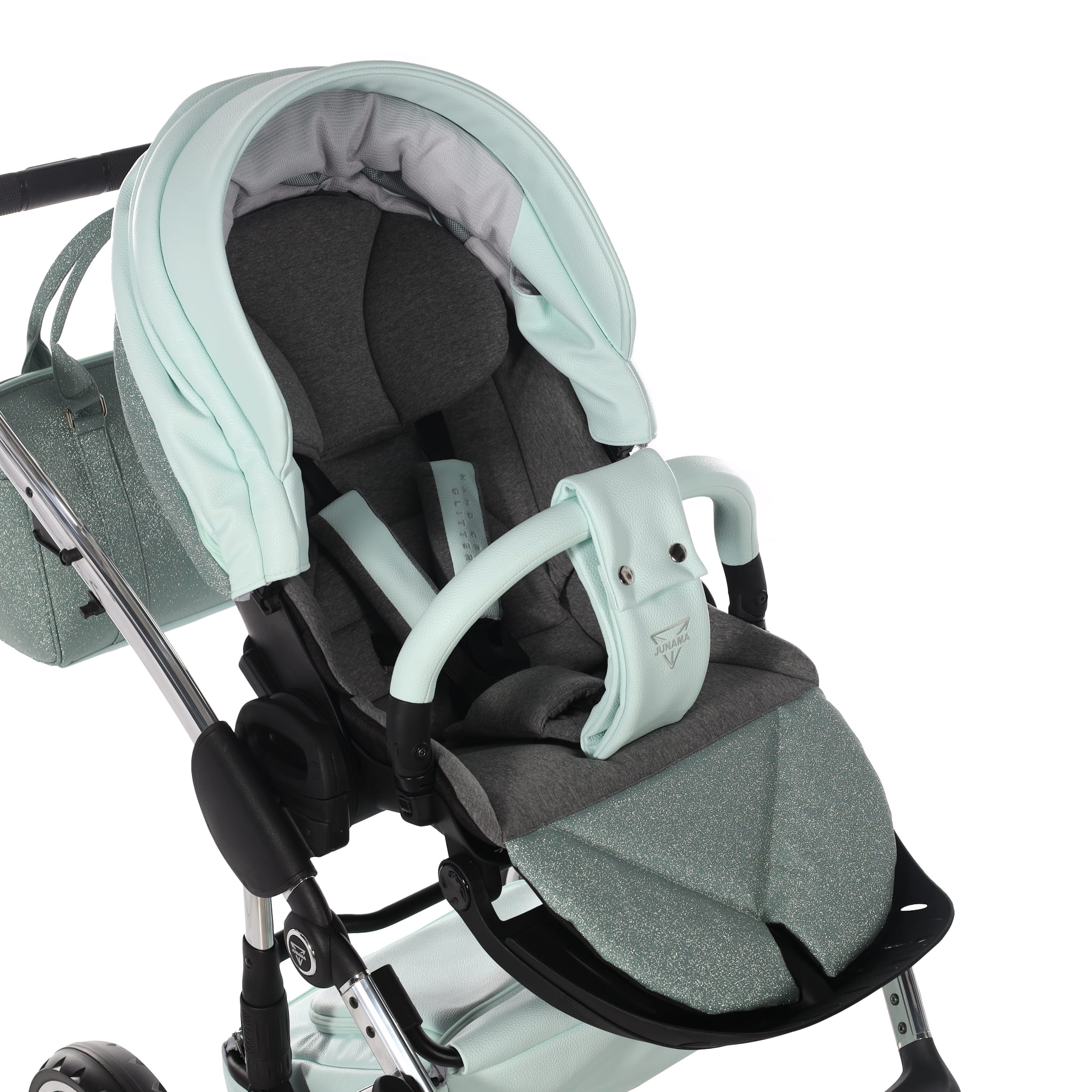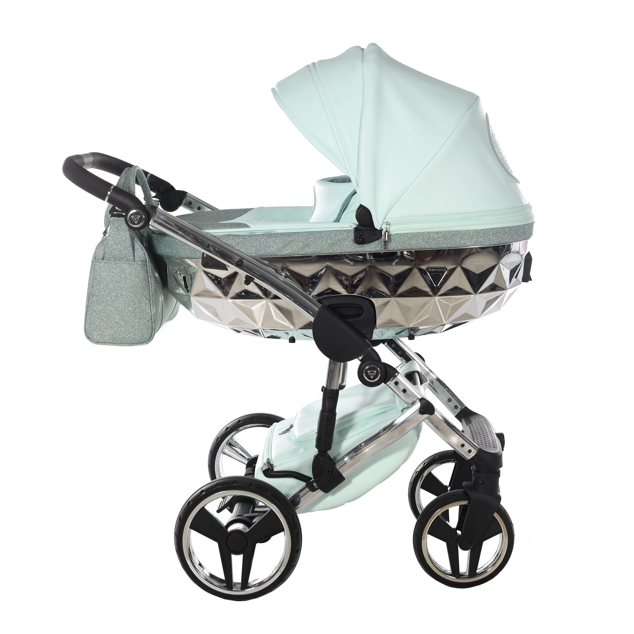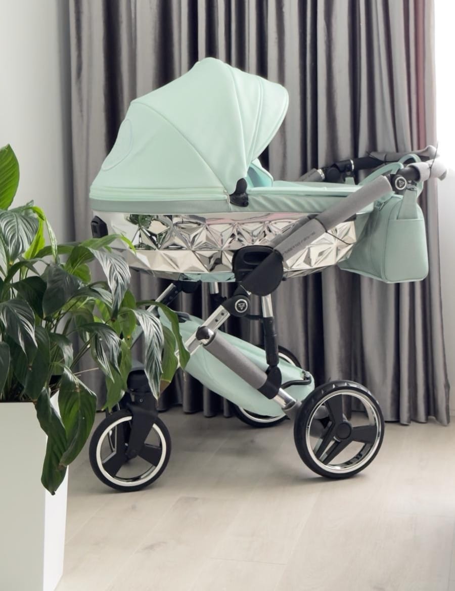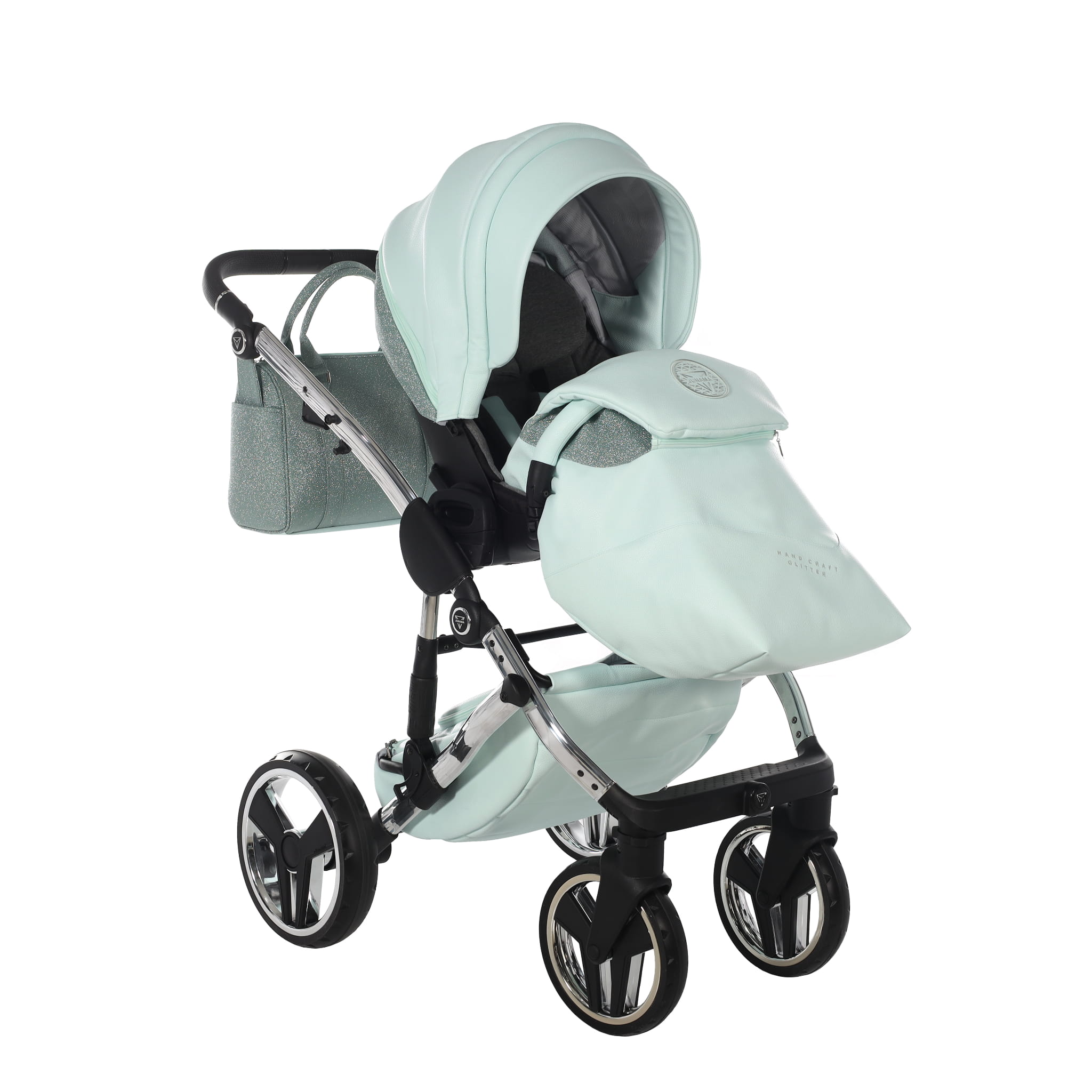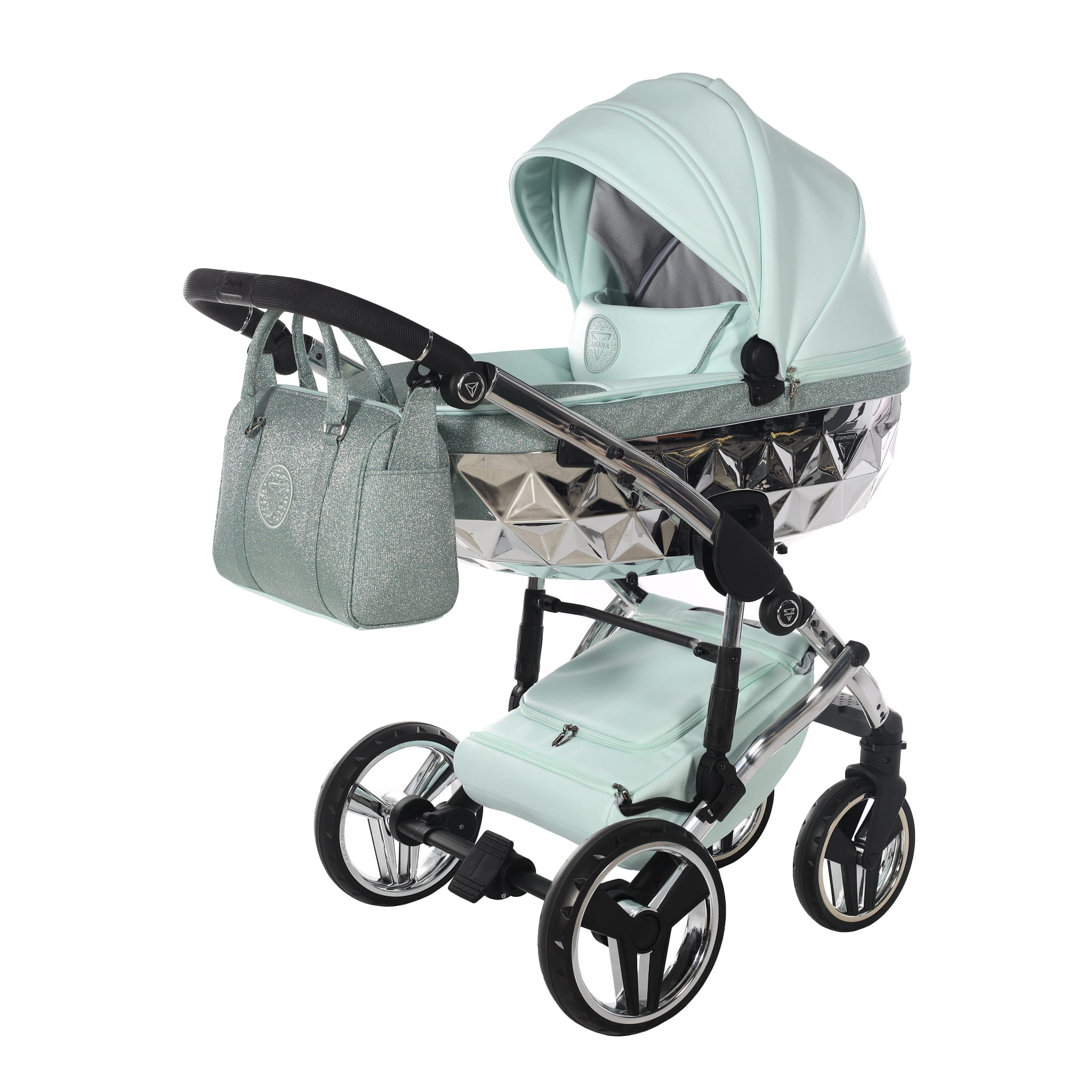 Junama Hand Craft Glitter 04 wózek dziecięcy z miętowej ekoskóry luksusowy wygląd dodaje diamentowa gondola. Wózek dziecięcy w zestawie z gondolą oraz spacerówką wykonaną z ekoskóry.