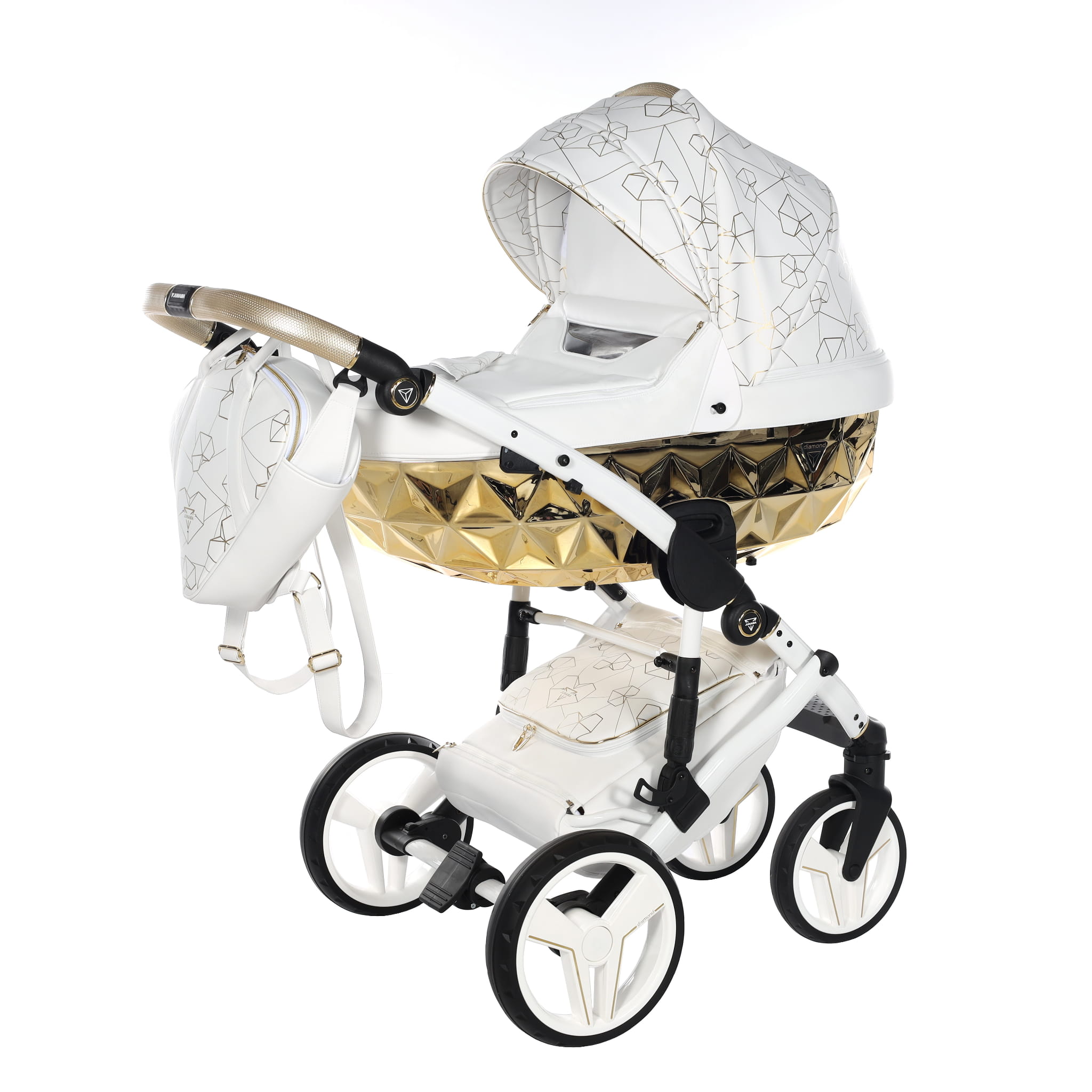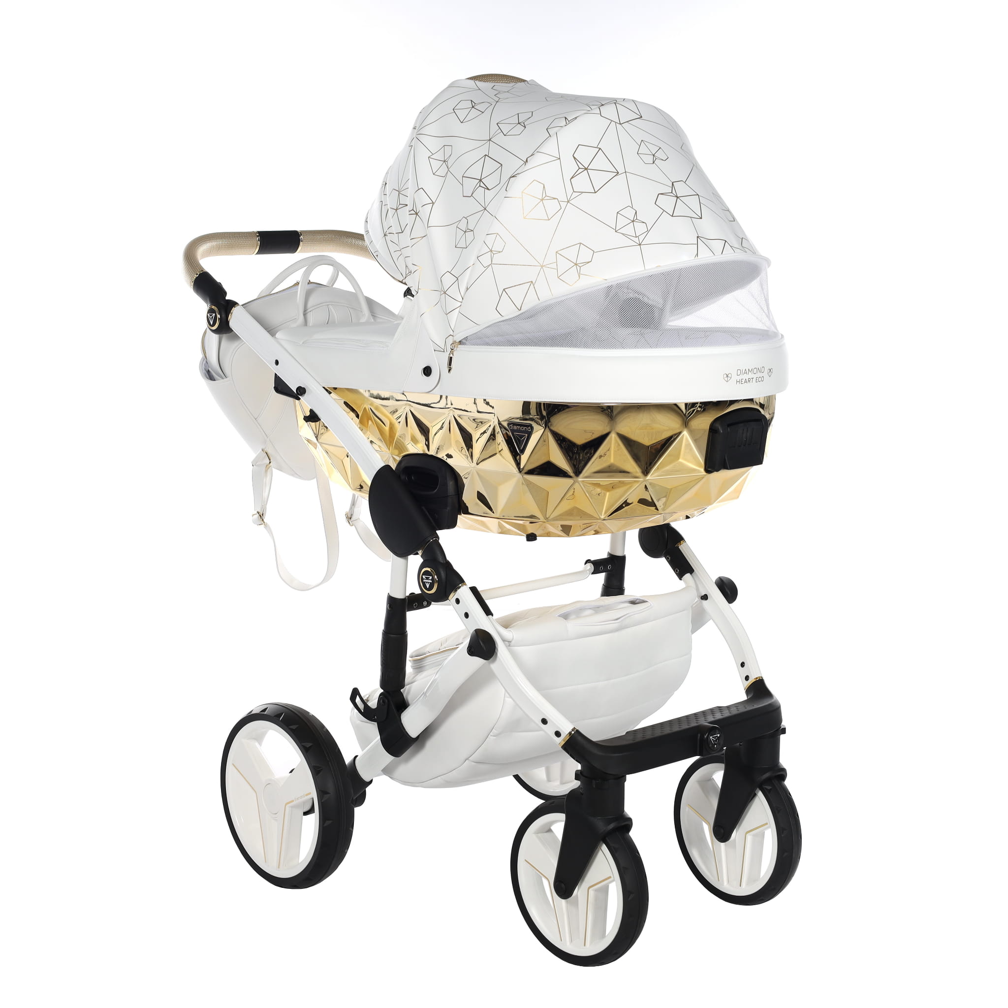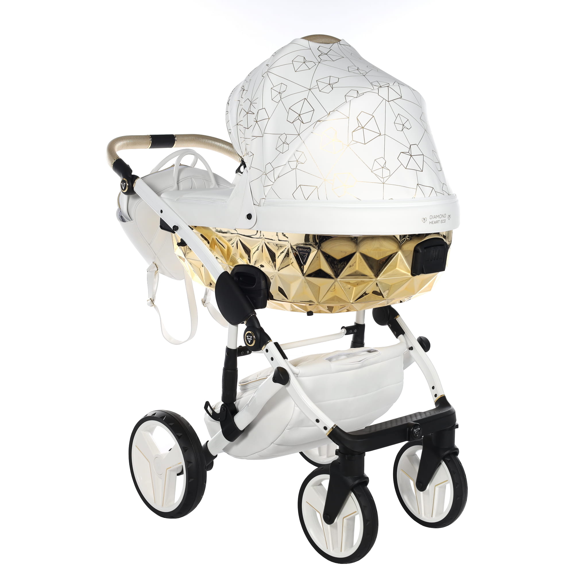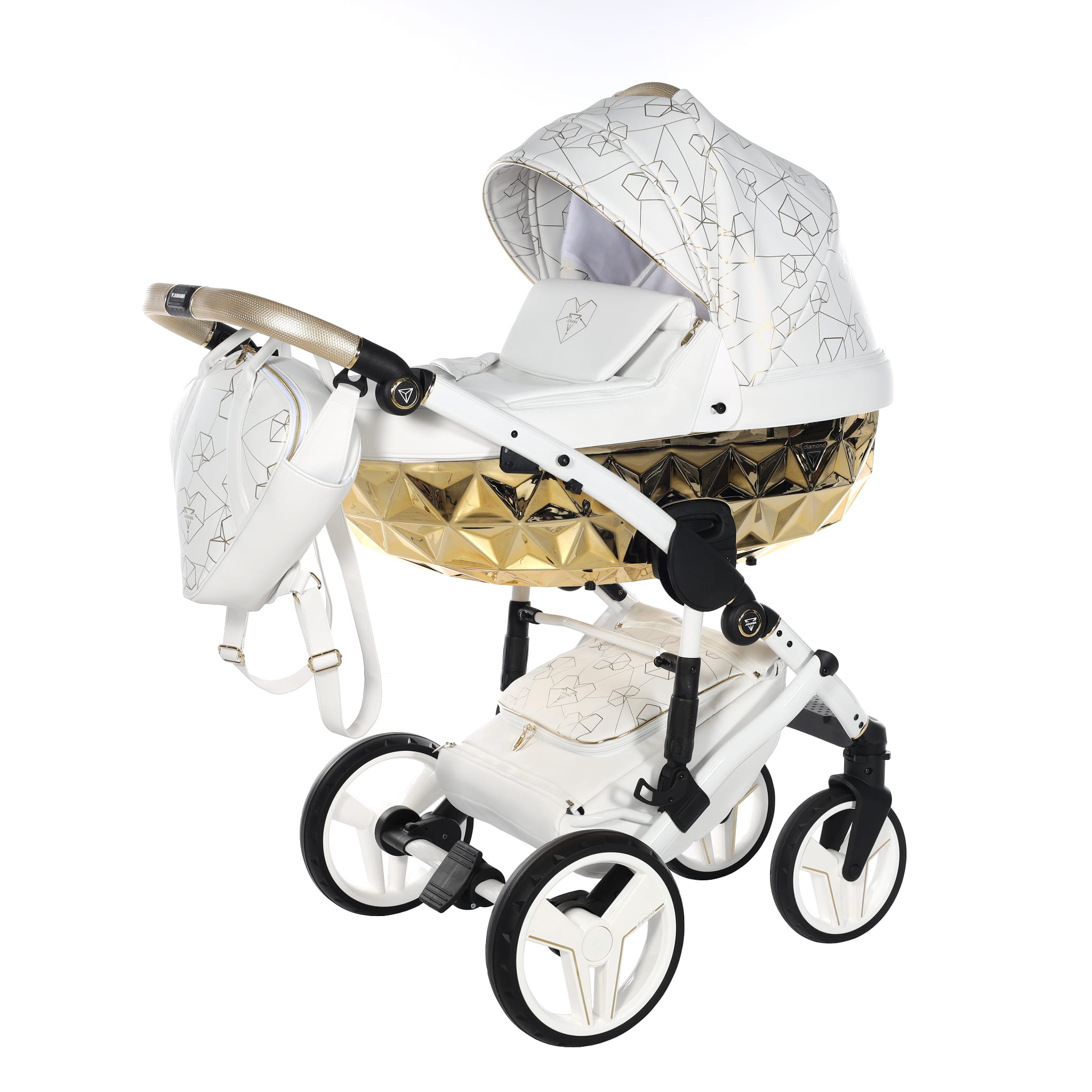 Najnowszy ekskluzywny model wózka Junama Heart w złotym kolorze z przepiękną torebkę w kształcie diamentu. Wózek wykonany z najwyższej jakości ekoskóry. Na budce znajdują się przepiękne serca oraz diamenty. Dopełnieniem wszystkiego są wszyte diamenciki. Diamentowa gondola w złotym kolorze prezentuje się bardzo oryginalnie z białą konstrukcją. Niepowtarzalny model został stworzony w Polsce.