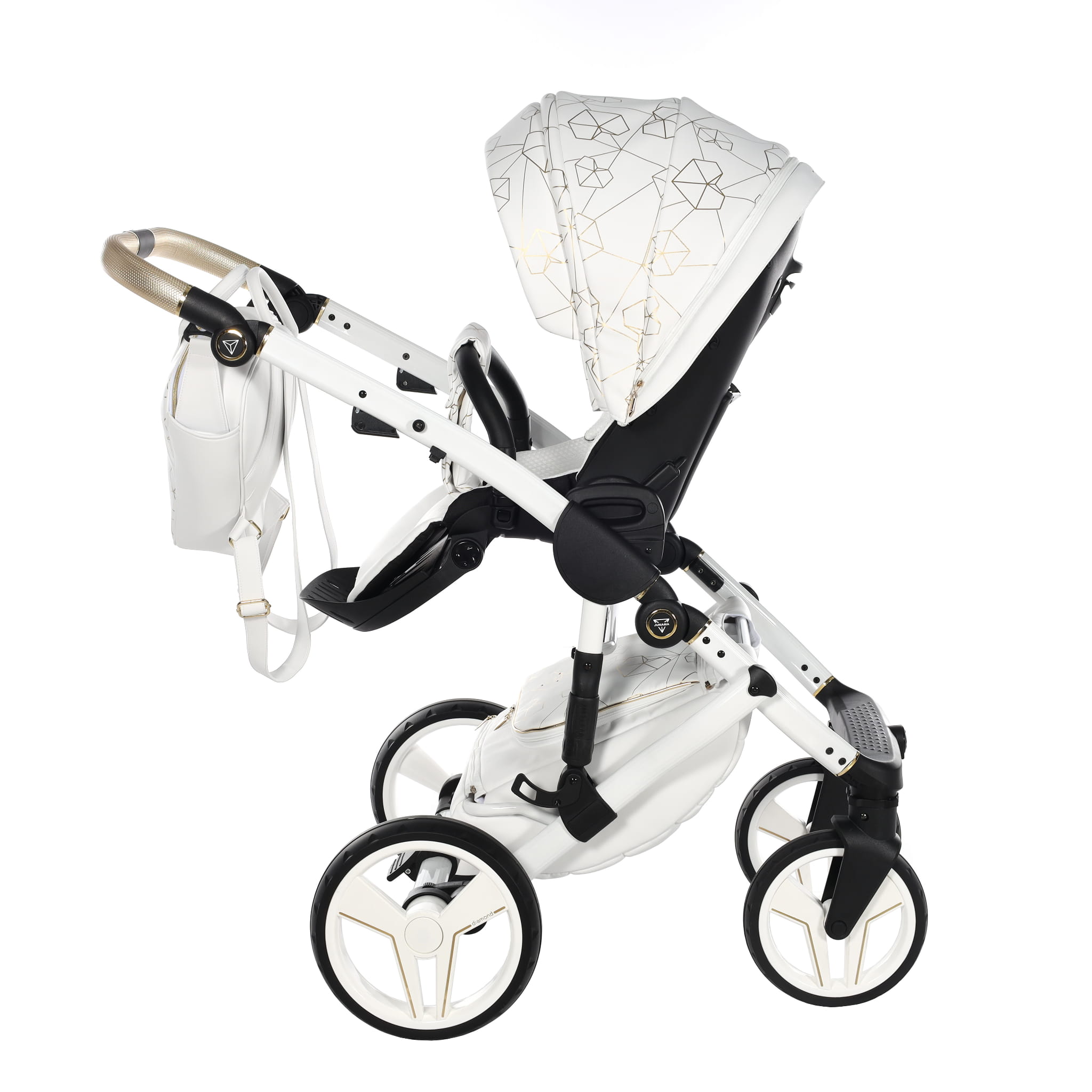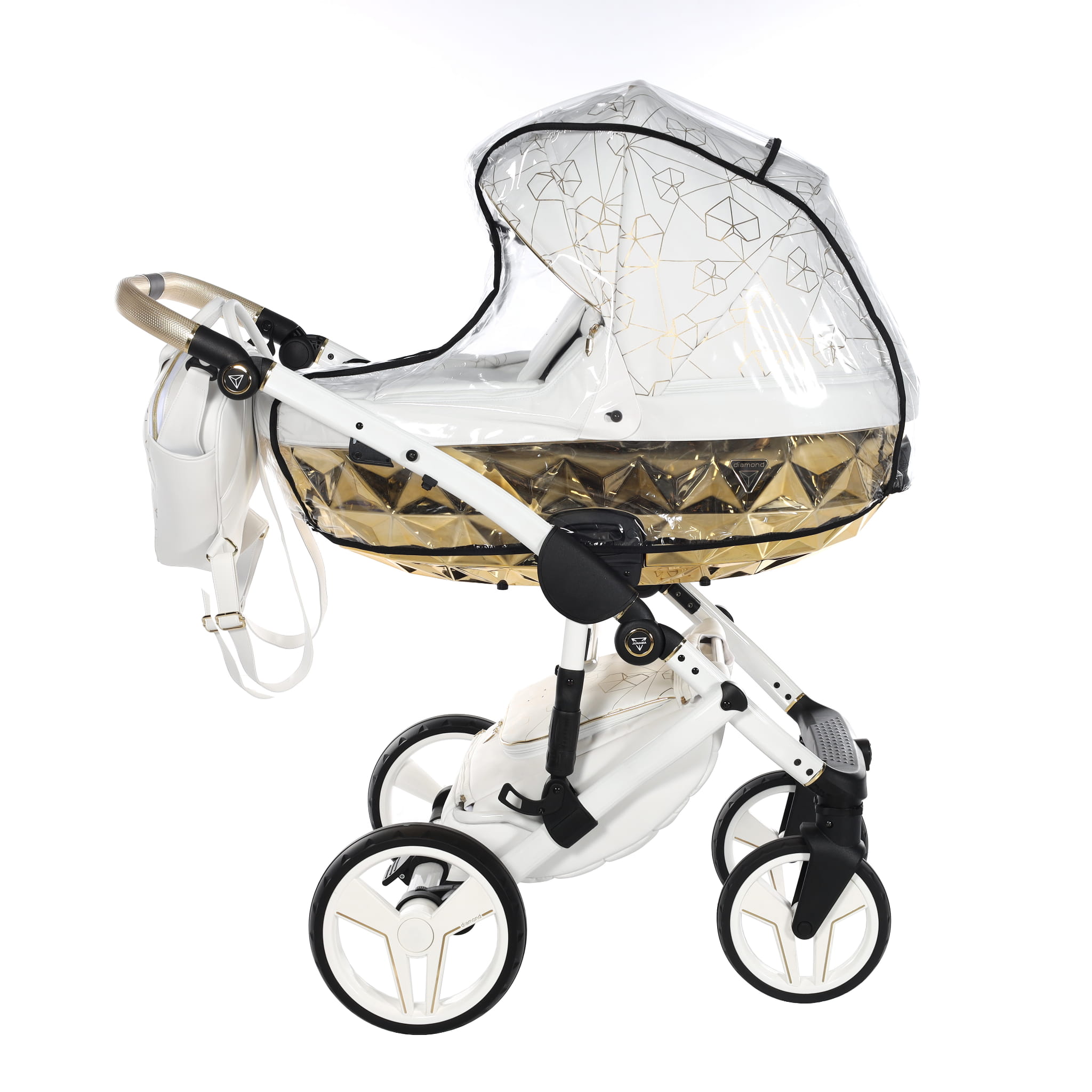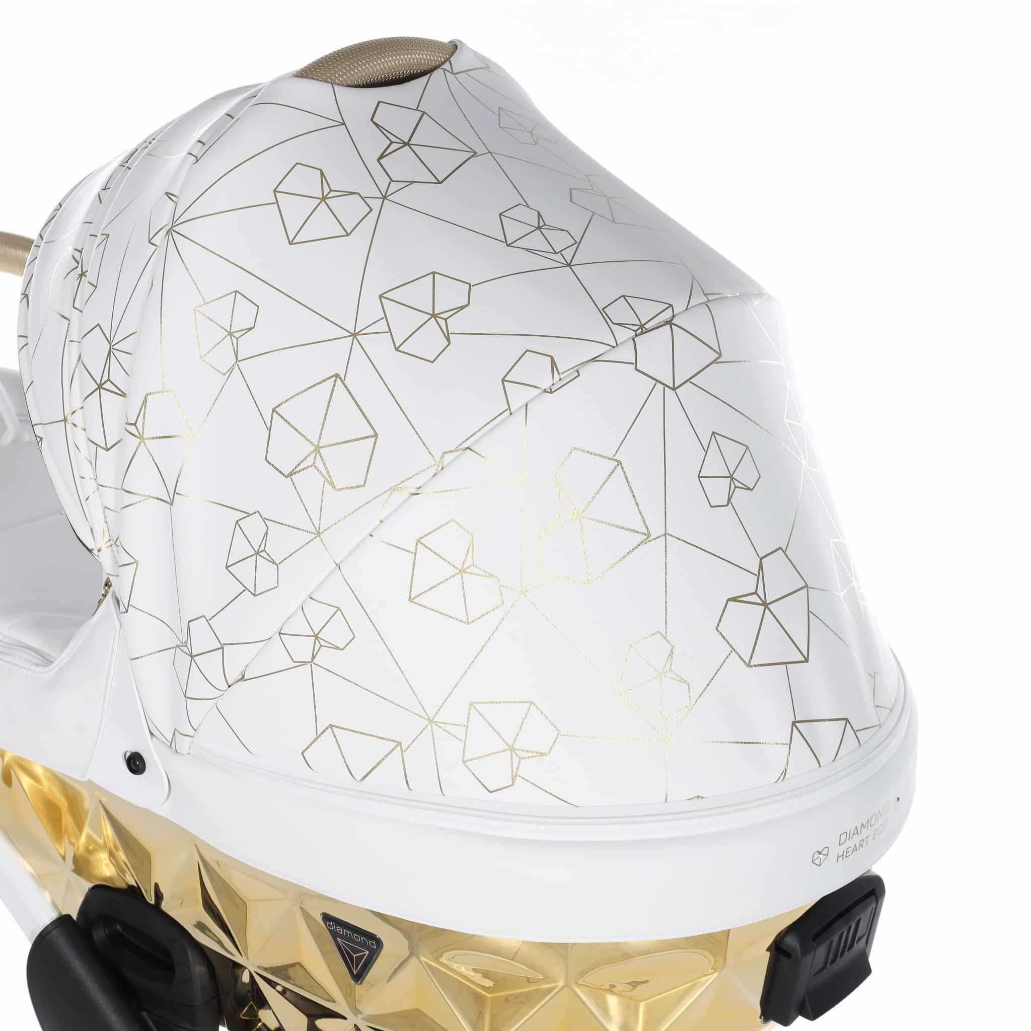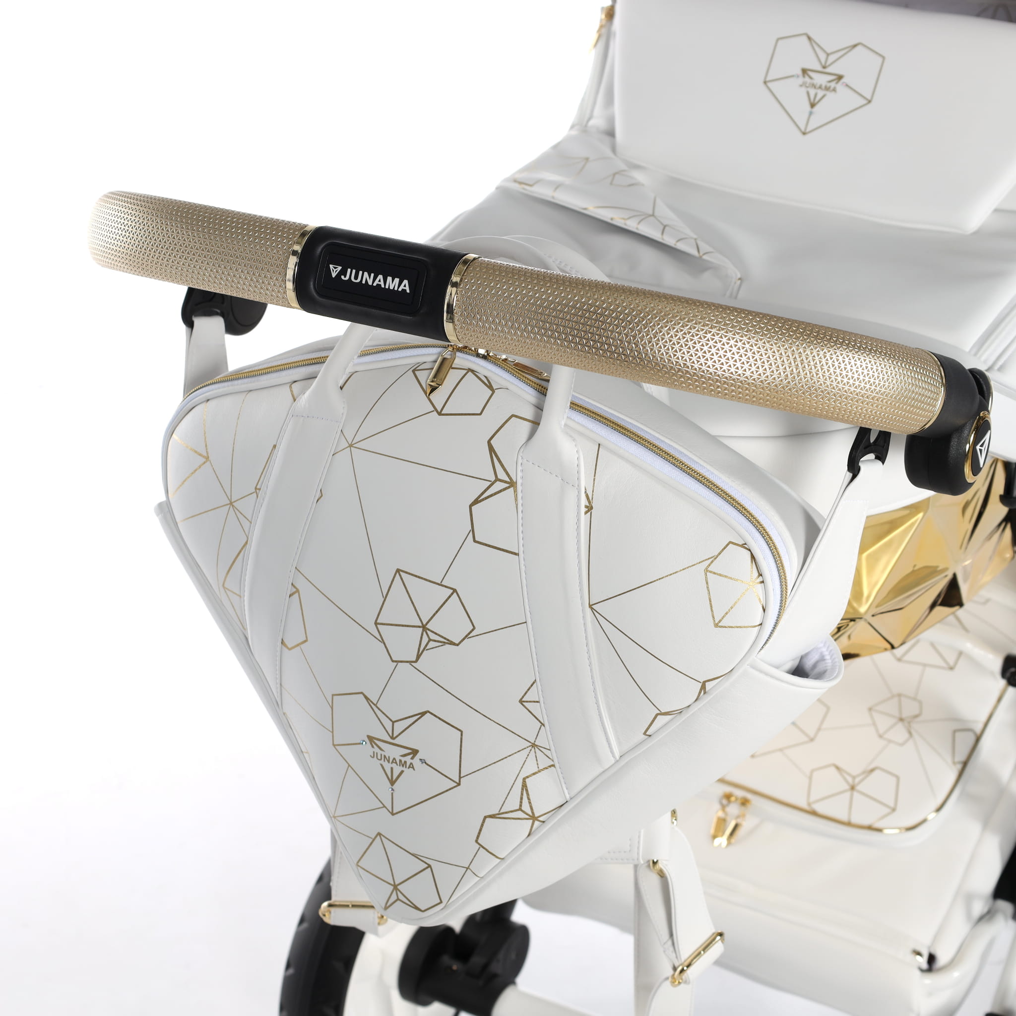 Najnowszy ekskluzywny model wózka Junama Heart w złotym kolorze z przepiękną torebkę w kształcie diamentu. Wózek wykonany z najwyższej jakości ekoskóry. Na budce znajdują się przepiękne serca oraz diamenty. Dopełnieniem wszystkiego są wszyte diamenciki. Diamentowa gondola w złotym kolorze prezentuje się bardzo oryginalnie z białą konstrukcją. Niepowtarzalny model został stworzony w Polsce.