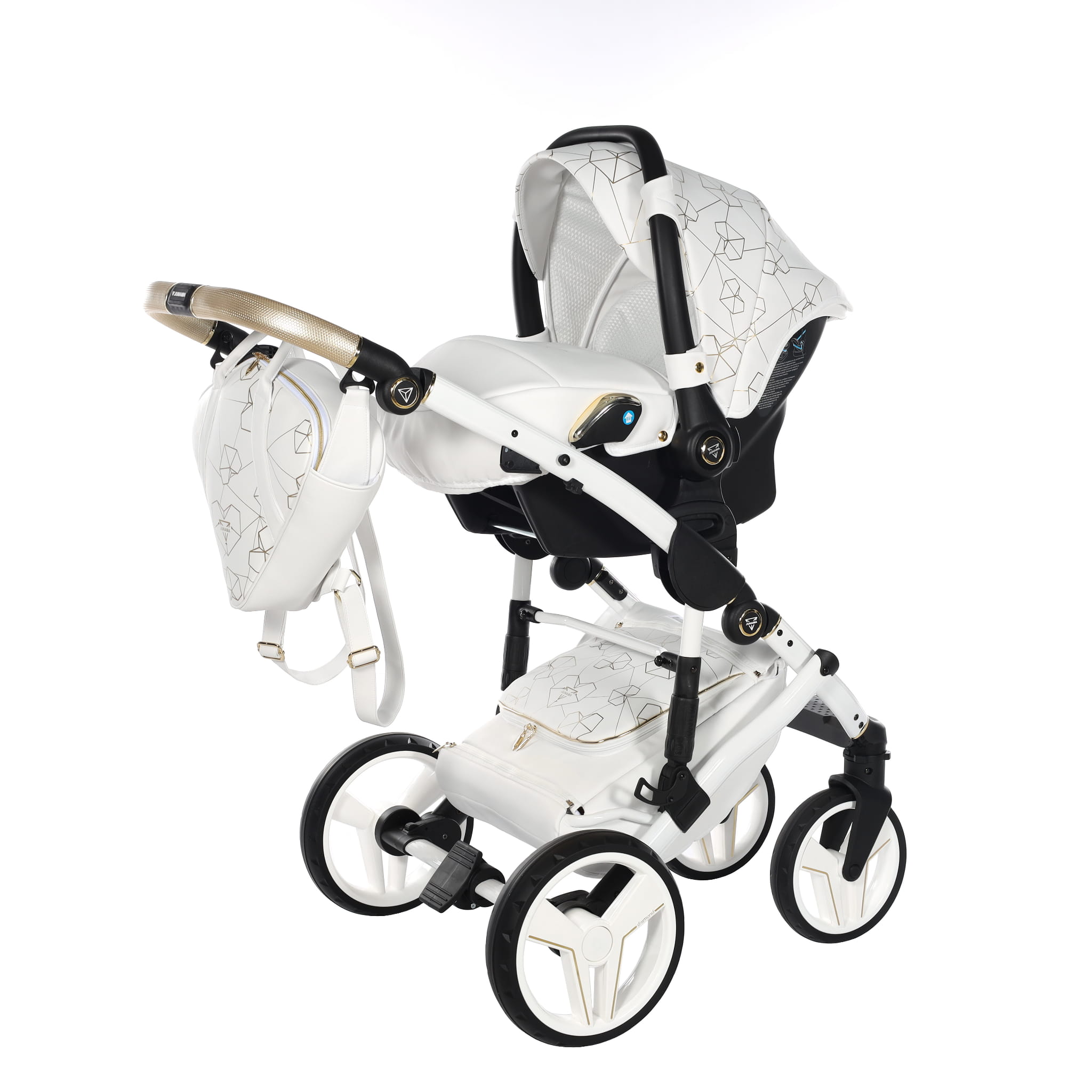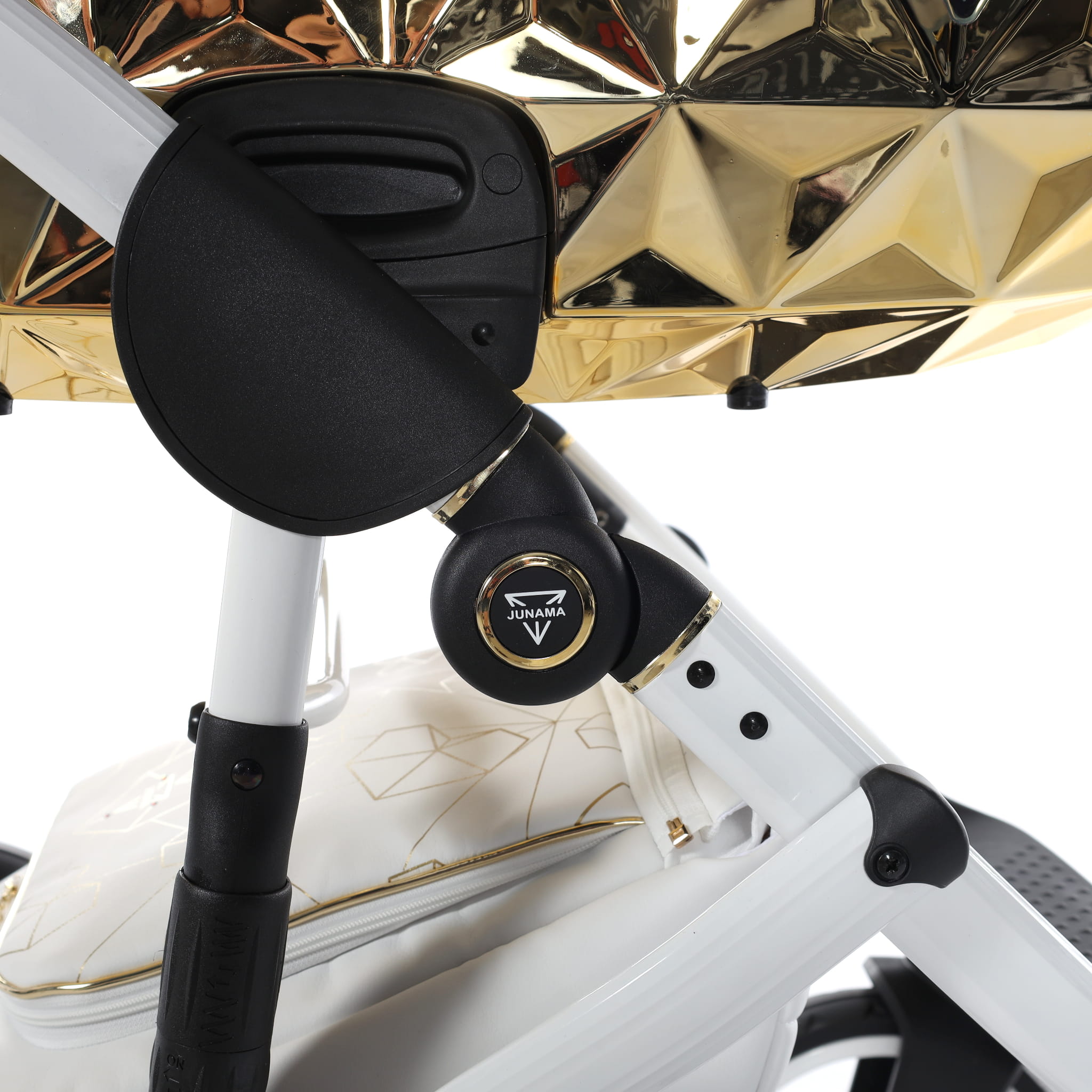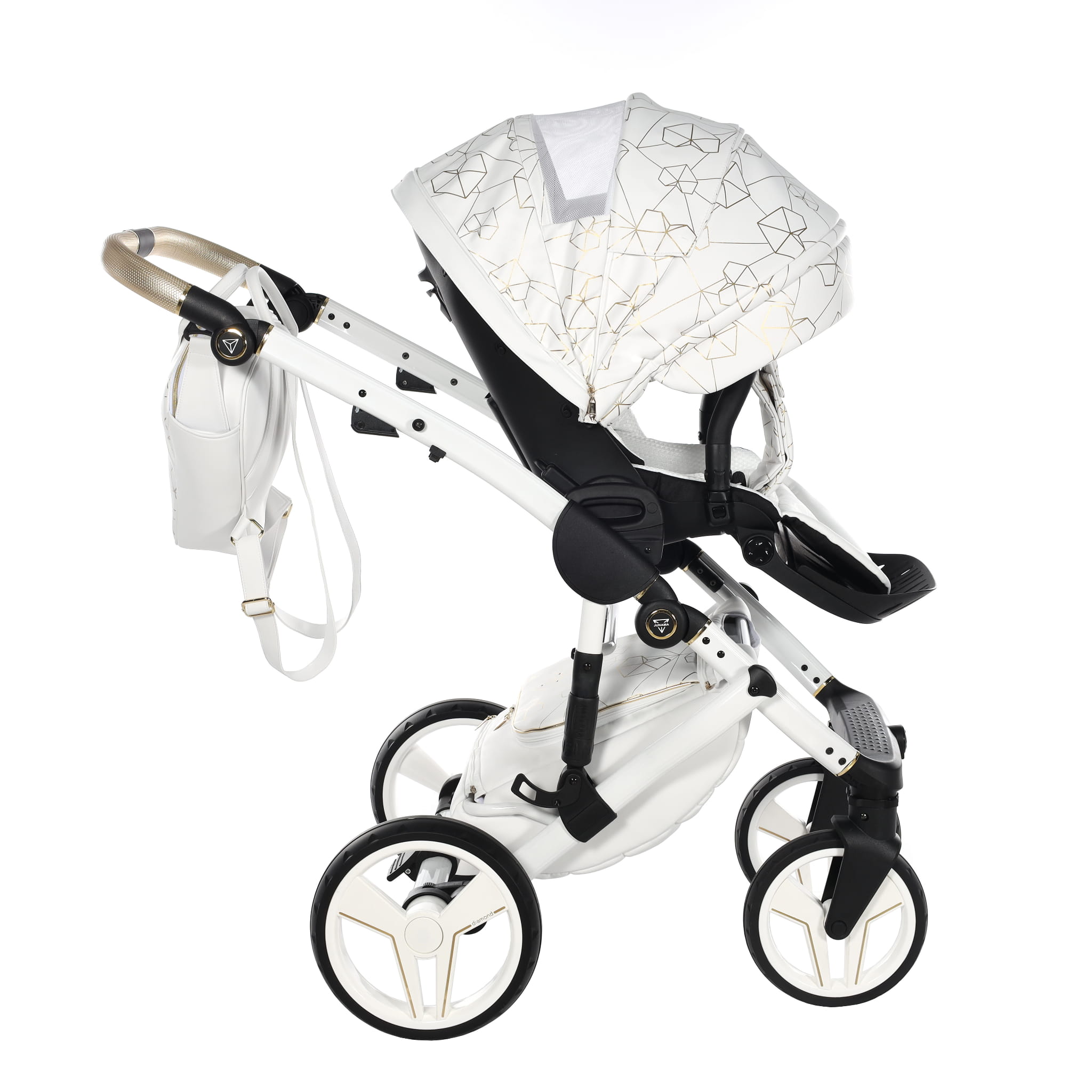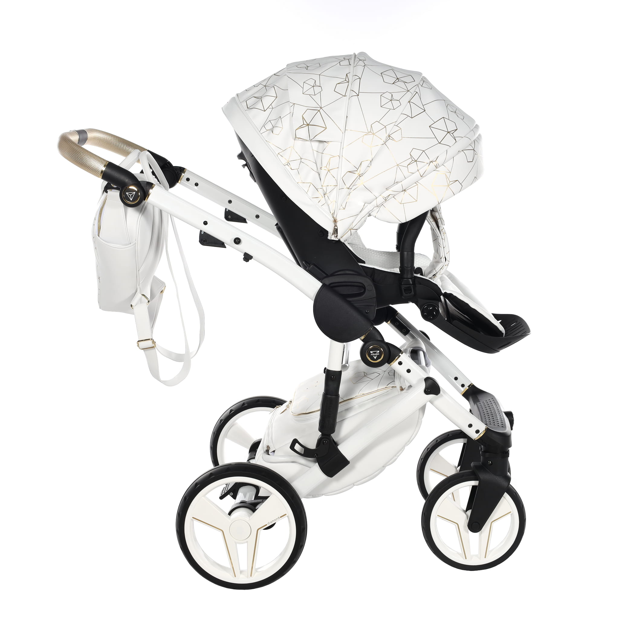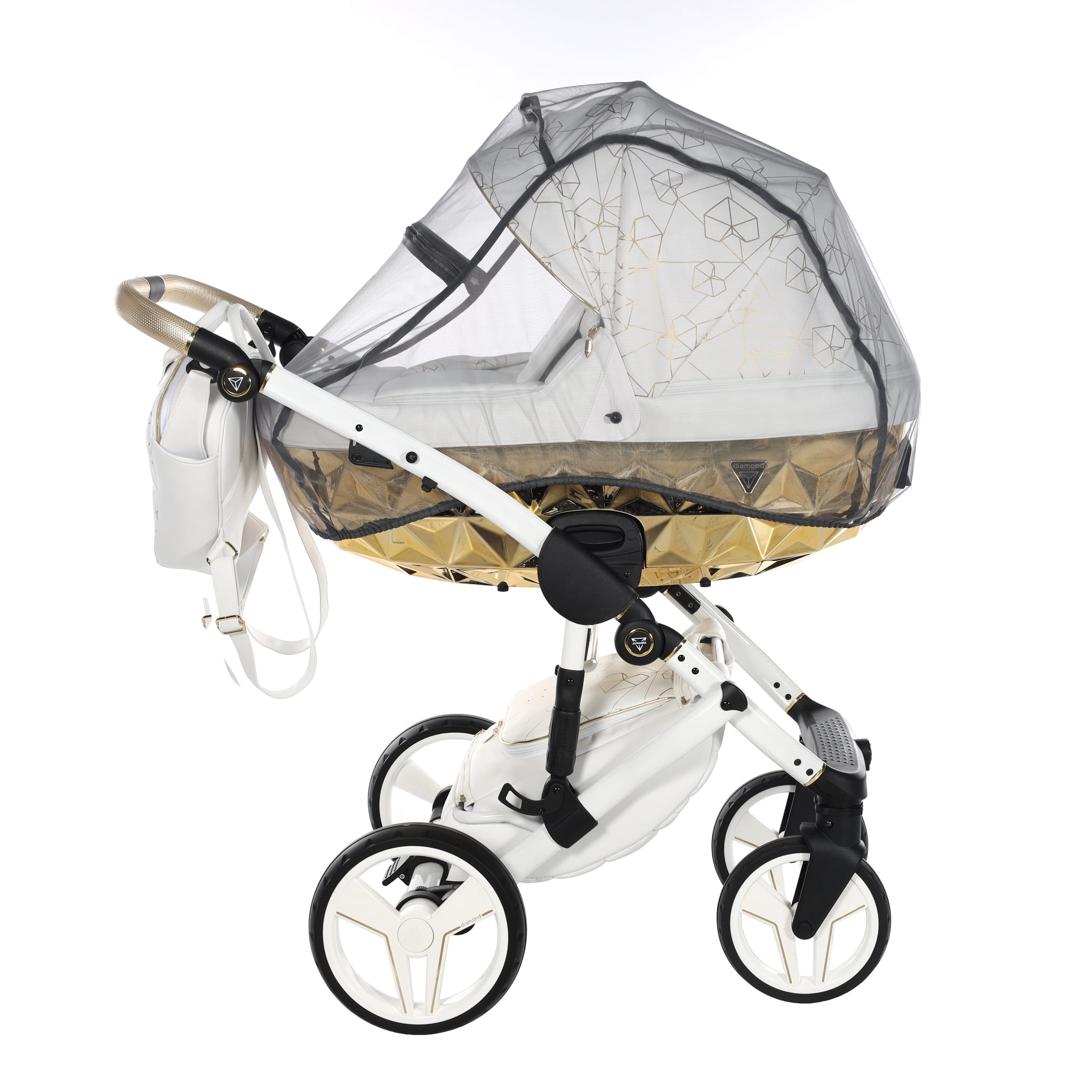 Najnowszy ekskluzywny model wózka Junama Heart w złotym kolorze z przepiękną torebkę w kształcie diamentu. Wózek wykonany z najwyższej jakości ekoskóry. Na budce znajdują się przepiękne serca oraz diamenty. Dopełnieniem wszystkiego są wszyte diamenciki. Diamentowa gondola w złotym kolorze prezentuje się bardzo oryginalnie z białą konstrukcją. Niepowtarzalny model został stworzony w Polsce.