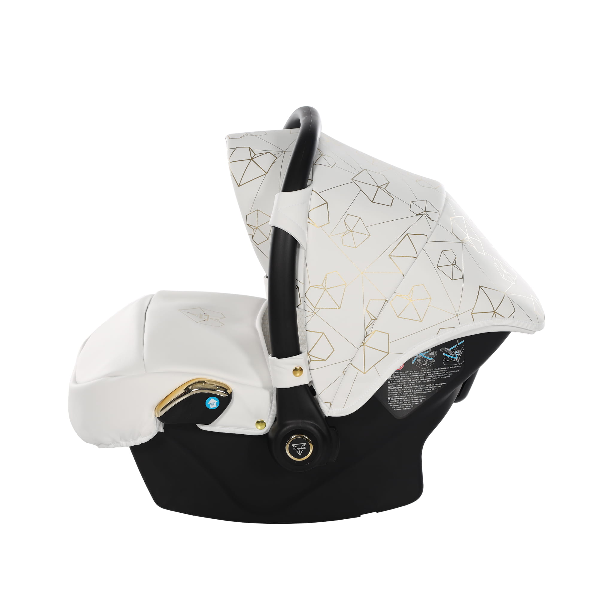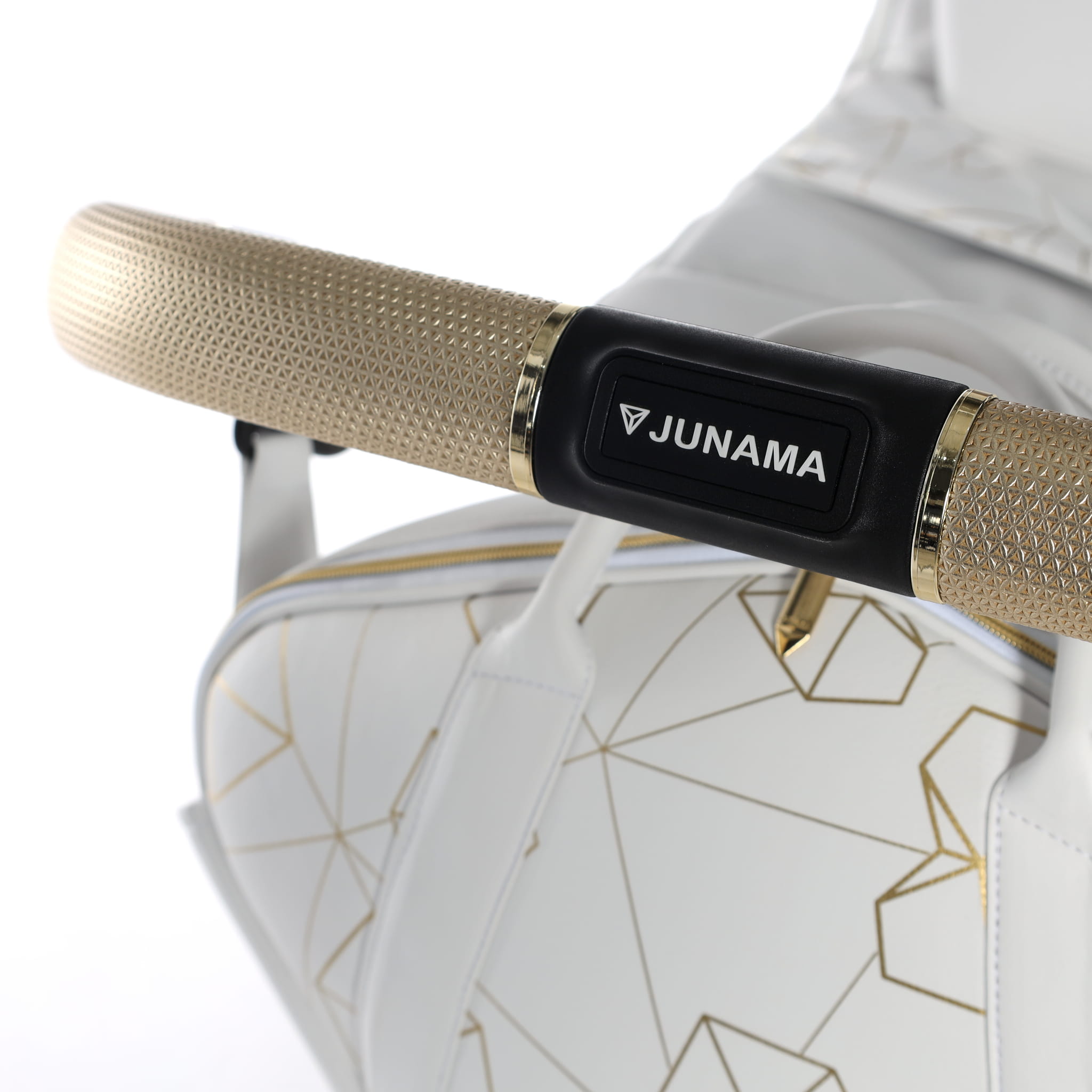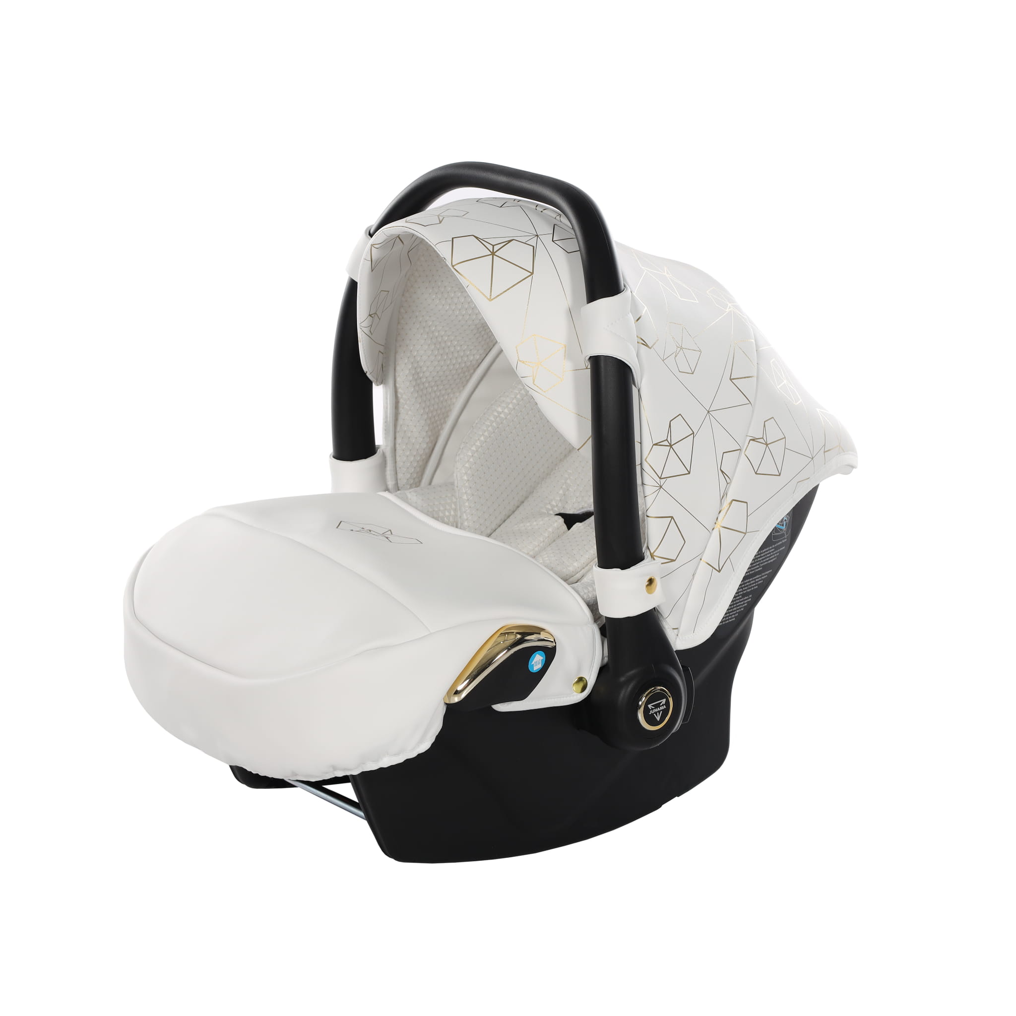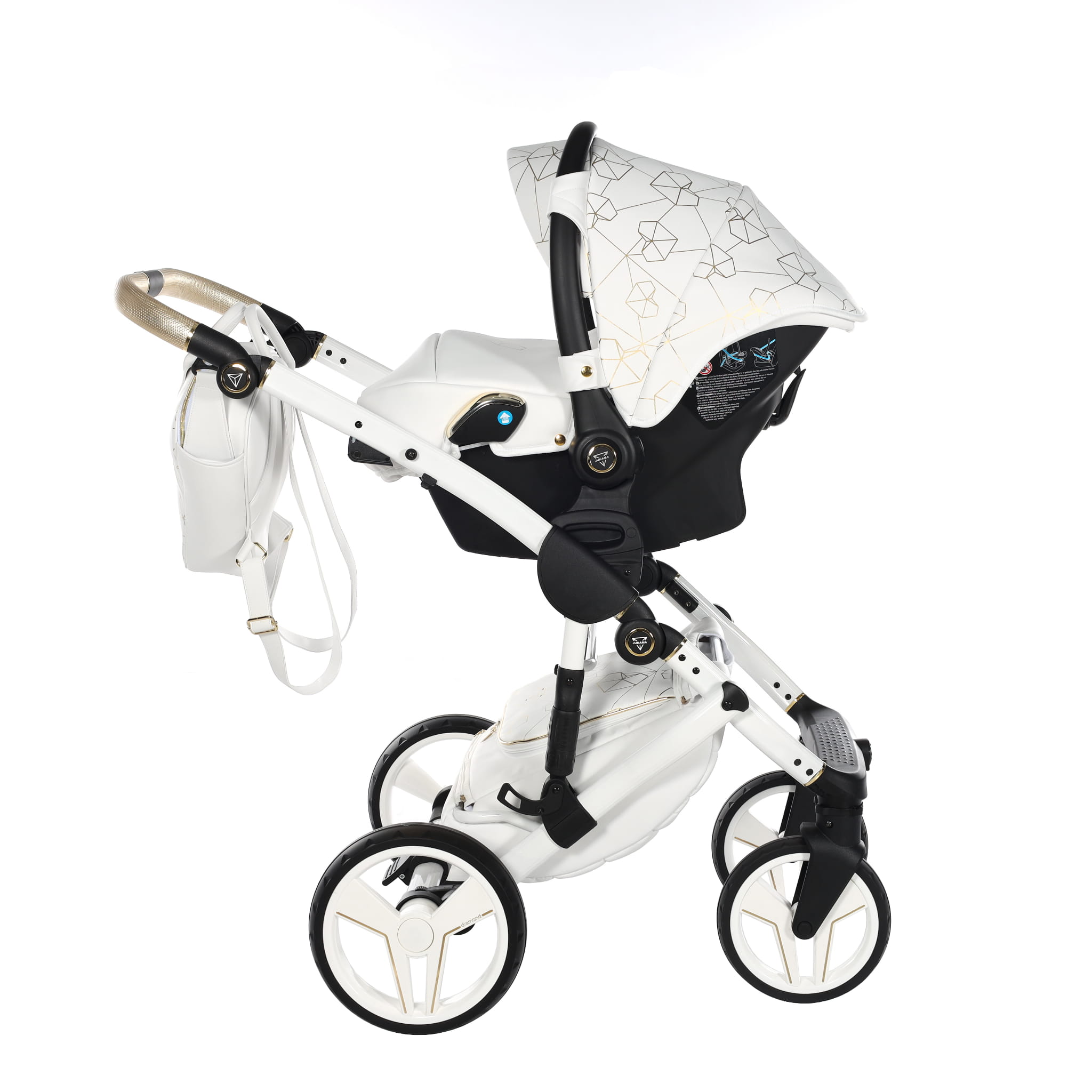 Najnowszy ekskluzywny model wózka Junama Heart w złotym kolorze z przepiękną torebkę w kształcie diamentu. Wózek wykonany z najwyższej jakości ekoskóry. Na budce znajdują się przepiękne serca oraz diamenty. Dopełnieniem wszystkiego są wszyte diamenciki. Diamentowa gondola w złotym kolorze prezentuje się bardzo oryginalnie z białą konstrukcją. Niepowtarzalny model został stworzony w Polsce.