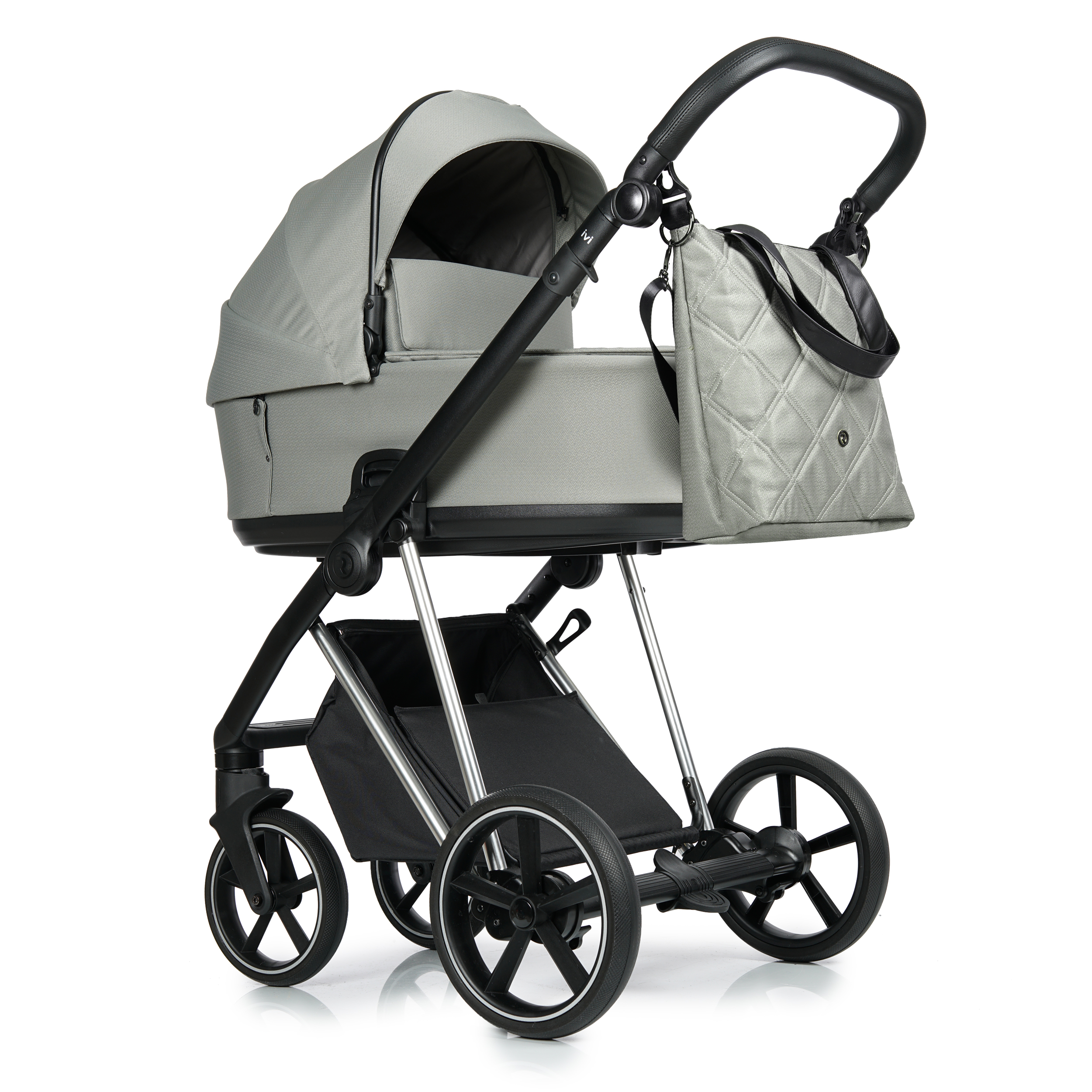 Regulowana rączka obszyta eko-skórą. Łatwy i wygodny system „Click” przy montażu gondoli, spacerówki i fotelika.